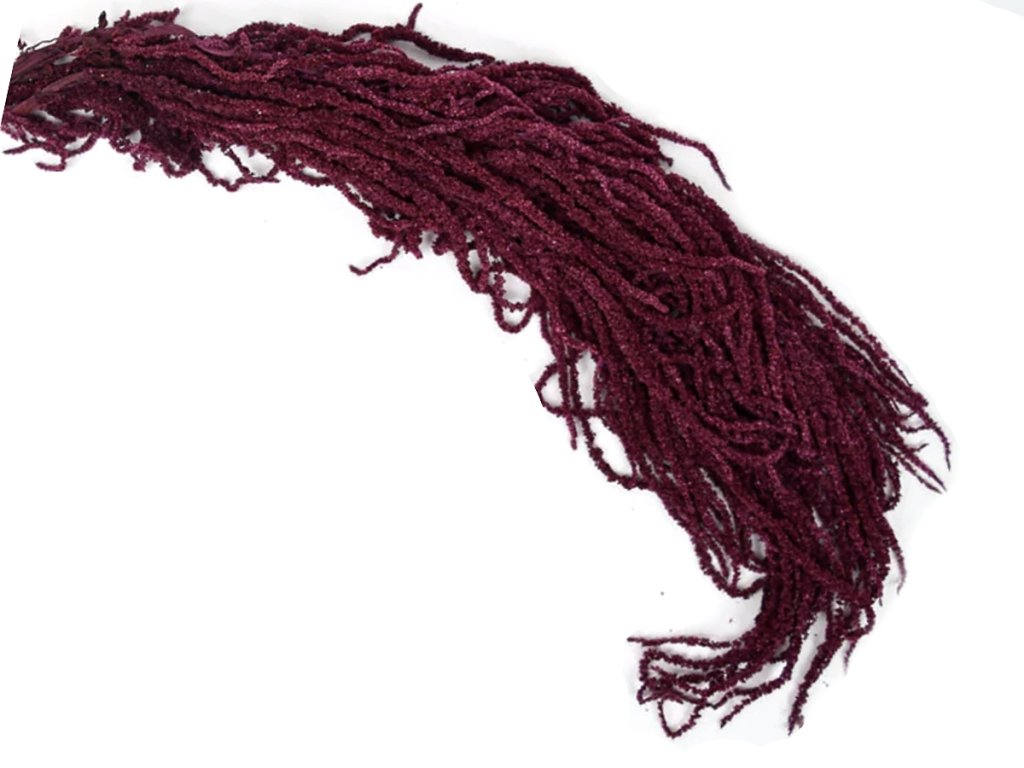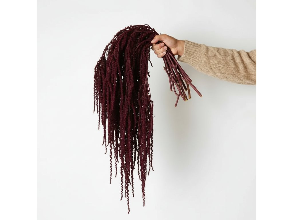Amaranthus caudatus is among the traditional ornamental species cultivated mainly for its decorative tassels. It is grown in regions with a warm and dry climate, where it achieves the most intense colors. After harvesting, the plant is gently cleaned, sorted, and then stabilized — a process that replaces the natural sap with glycerin or another stabilizing mixture. Thanks to this, it retains its flexibility, color, and natural appearance for many months or even years. Burgundy shades are achieved through a combination of natural dark plant pigmentation and eco-friendly dyeing.