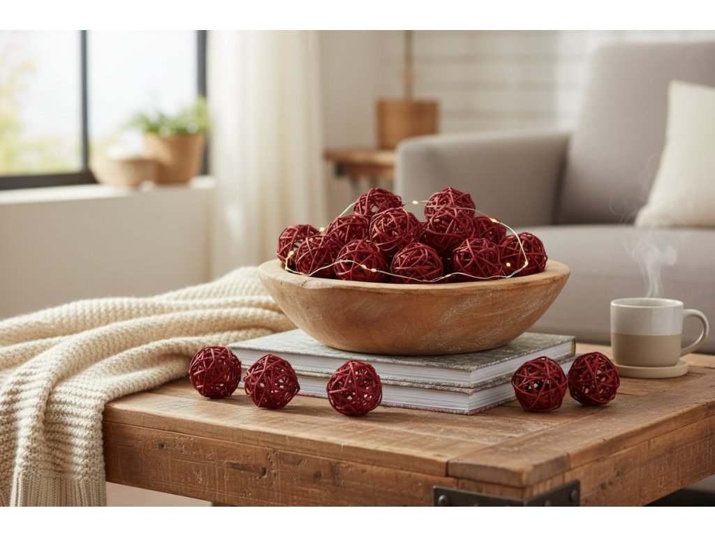 Rattan balls are a practical decorative element that helps create volume and a visual "point of interest" without making the composition look heavy. Use them in wreaths (for gluing or inserting), in dry arrangements in bowls and boxes, for festive decorations, and for a quick refresh of gift wrapping. The burgundy color works wonderfully in autumn and winter decorations, in wedding combinations with nude tones, and as a striking accent in modern minimalist arrangements.