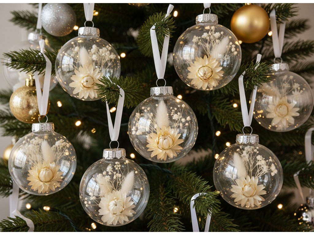 Clear baubles symbolize purity, light, and new beginnings. When filled with dried flowers, they create a small enclosed world – a natural talisman that will retain its beauty for the whole season and the next year. Christmas ornaments filled with dried materials are a hit in recent seasons, especially for lovers of eco and natural styles.