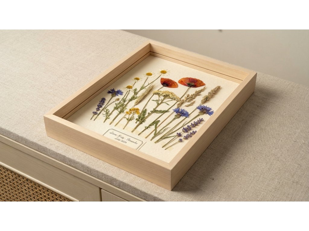 Keep the frame dry and protect it from prolonged direct sunlight to prevent dried flowers and prints from fading. Clean the transparent panes with a soft microfiber cloth (ideally without harsh chemicals) to avoid scratches. Handle with care when changing the contents – especially with pressed flowers.
