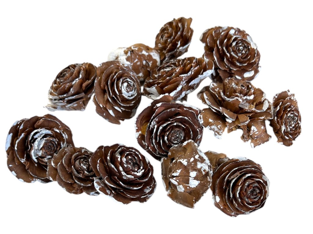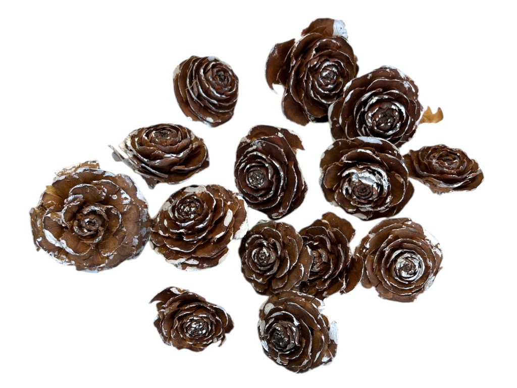 Cedar roses (Cedrus), size 5–7 cm, 100 g, with whitened edges are decorative elements suitable for arrangements, wreaths, table decorations, and winter or Christmas compositions. The delicate white edges give arrangements an effect of light snow and an elegant natural look. The roses can be combined with dried flowers, pine cones, moss, or other natural decorations.