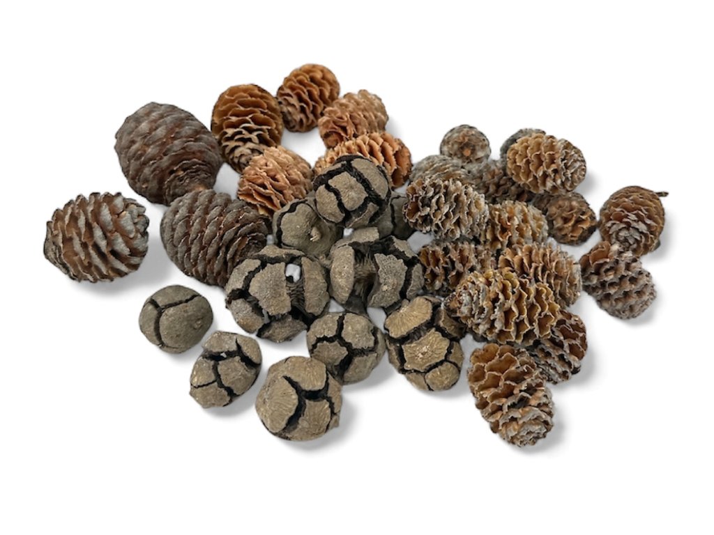 The pine cones come from more exotic species of conifers growing outside of Central Europe. After harvesting, they are thoroughly dried, cleaned, and sorted to preserve their natural shape and color. They do not contain any chemical additives, are 100% natural, and ready for immediate use.