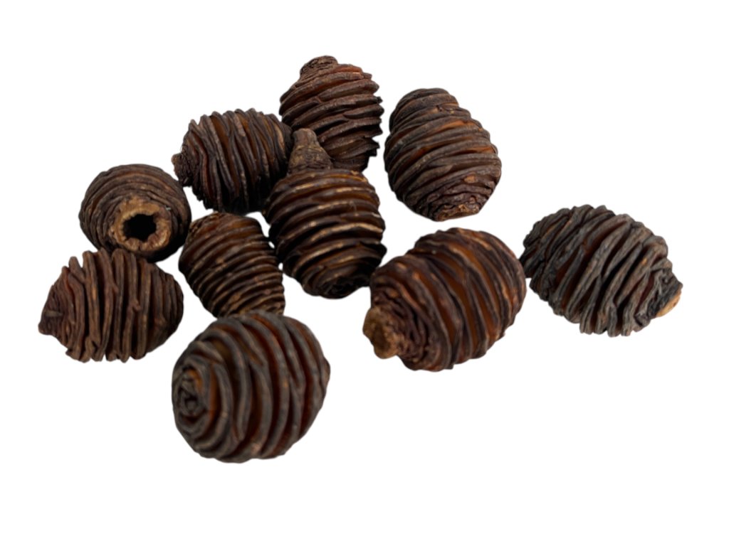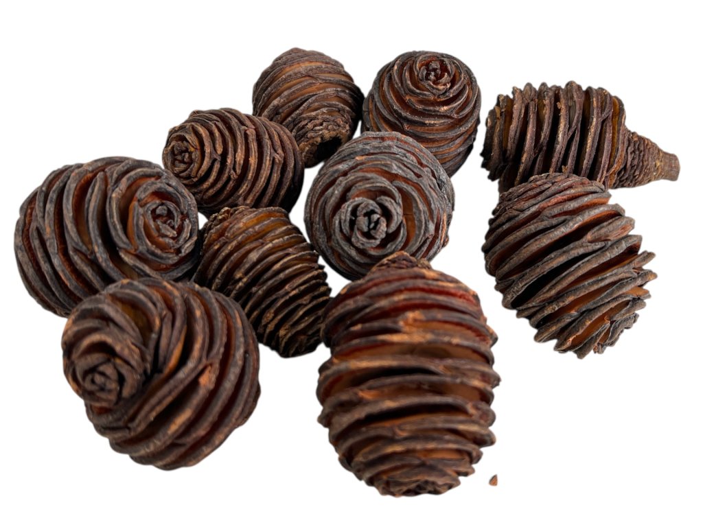 Dried Platyspermum cones 200g (approx. 9-14 pcs) are natural decorative materials that excel with their spiral shape. This shape adds visual depth and original texture to arrangements, making them perfect for autumn and winter table decorations, wreaths, hanging ornaments, or combined natural arrangements with moss, dried flowers, or sisal.