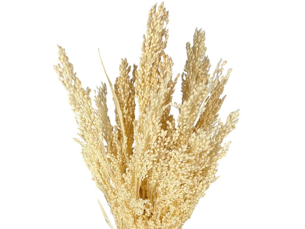 Millet originates from controlled European farms where it is grown without the use of aggressive chemicals. After harvesting, the ears are gently dried and then bleached to preserve their typical structure while acquiring an elegant light appearance.