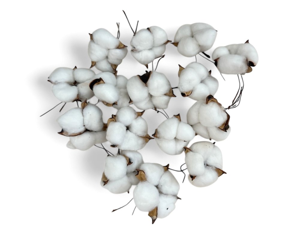 Cotton originates from the tropical regions of India and Africa, but for floristic purposes, it is also grown and dried in the Mediterranean. Each flower is hand-picked at the moment the boll naturally opens and reveals its fluffy fiber. After drying, it is fixed to preserve its shape and softness. This dried cotton is not dyed – its color is pure natural white with slightly brown stems.