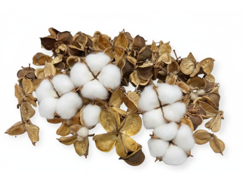 Cotton bolls come from the Gossypium genus, known mainly for cotton. After removing the white cotton fibers, hard, decorative casings remain, which are often used in floristry and handicrafts. Their natural brown color adds a rustic and authentic look to arrangements and allows for long-term use in decorations.