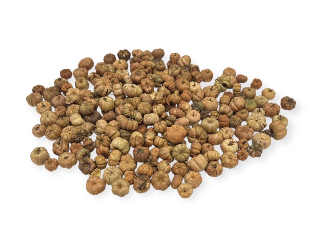 Putka pods, also known as Liliput mini gourds, are a popular floristry material due to their original shape and naturally decorative appearance. These dried fruits come from the Australian tree Glochidion ferdinandi, whose oval, segmented fruits, after drying, resemble small gourds or miniature pumpkins. In arrangements, they appear playful, striking, and add a warm natural character to compositions.