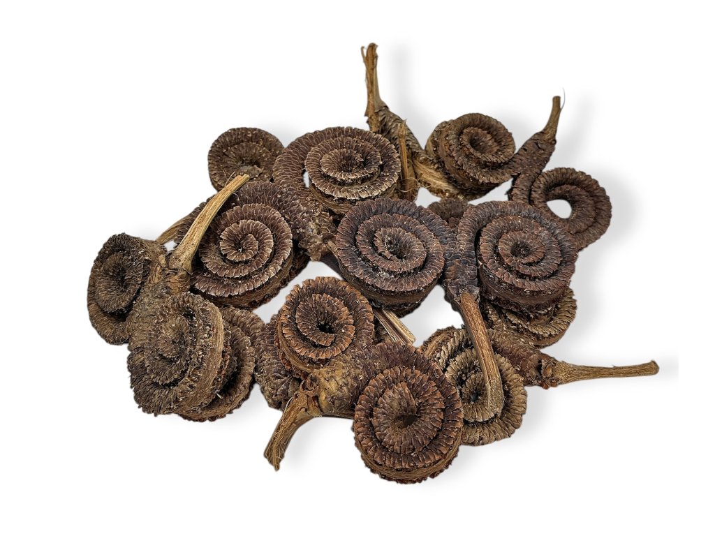 Palm rings are natural dried materials that are valued in floristry and interior decoration for their unique spiral or ring-shaped shape. These pieces, often referred to as "ram's horns" Ram's Horns) are made from dried parts of palm flowers or leaves that naturally curl up after drying. Each piece is unique and retains an organic shape and texture, giving the arrangements an authentic, exotic and rustic character.