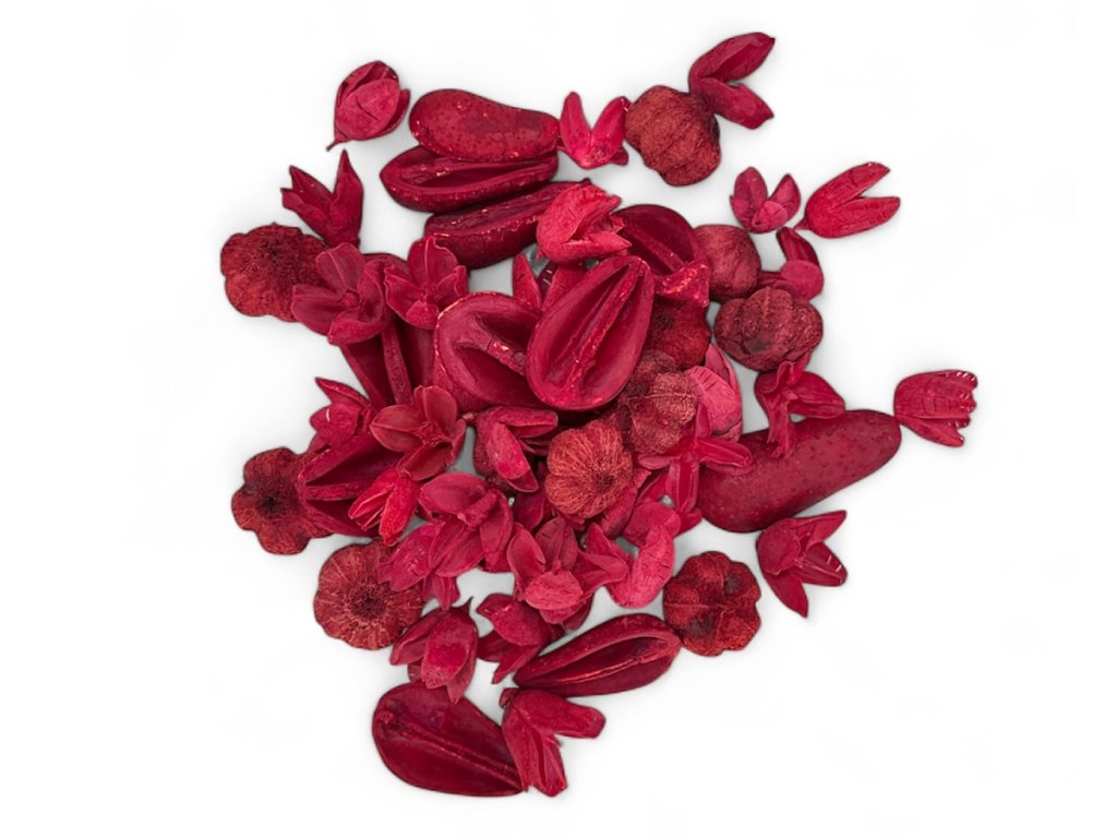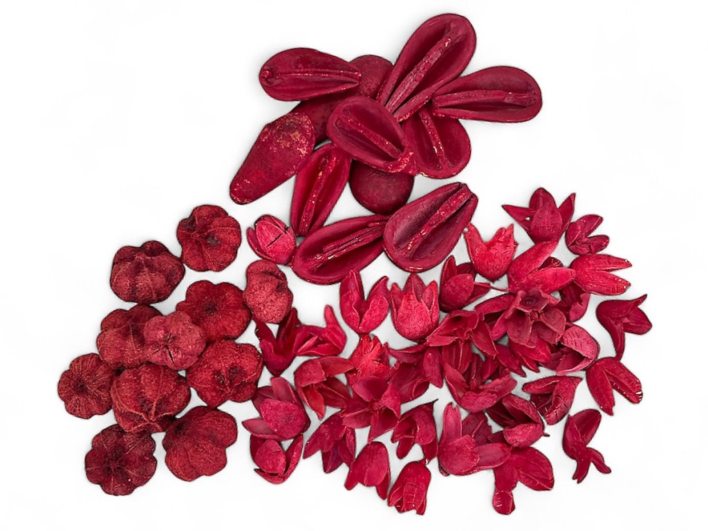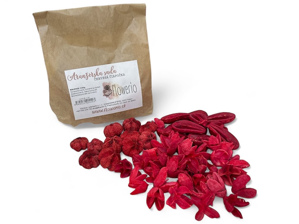The raw materials consist of various exotic fruits and structured dried materials (bakuli, miké, garlic heads). After harvesting, they are gently dried and then dyed in a bright red – shades with a matte finish that looks natural and elegant. Each package contains a balanced mix of shapes and textures suitable for florists and home crafters.