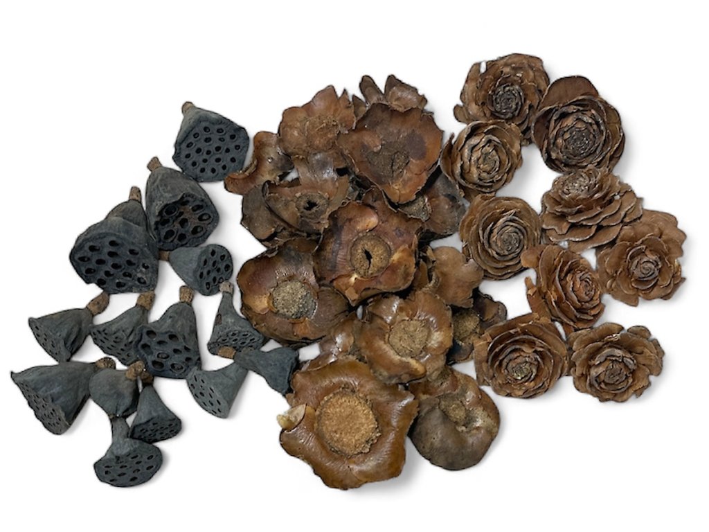 Coconut flowers, Lotus flowers (Nymphaea sp.), and cedar roses (Cedrus deodara) are carefully dried to preserve their shape, color, and texture. Palm flowers (Areca sp.) are processed to be available as whole flowers as well as small petals or shreds, ideal for detailed work. The entire mix is hand-composed and packed in an ecological paper bag, ensuring the quality and natural appearance of each set.