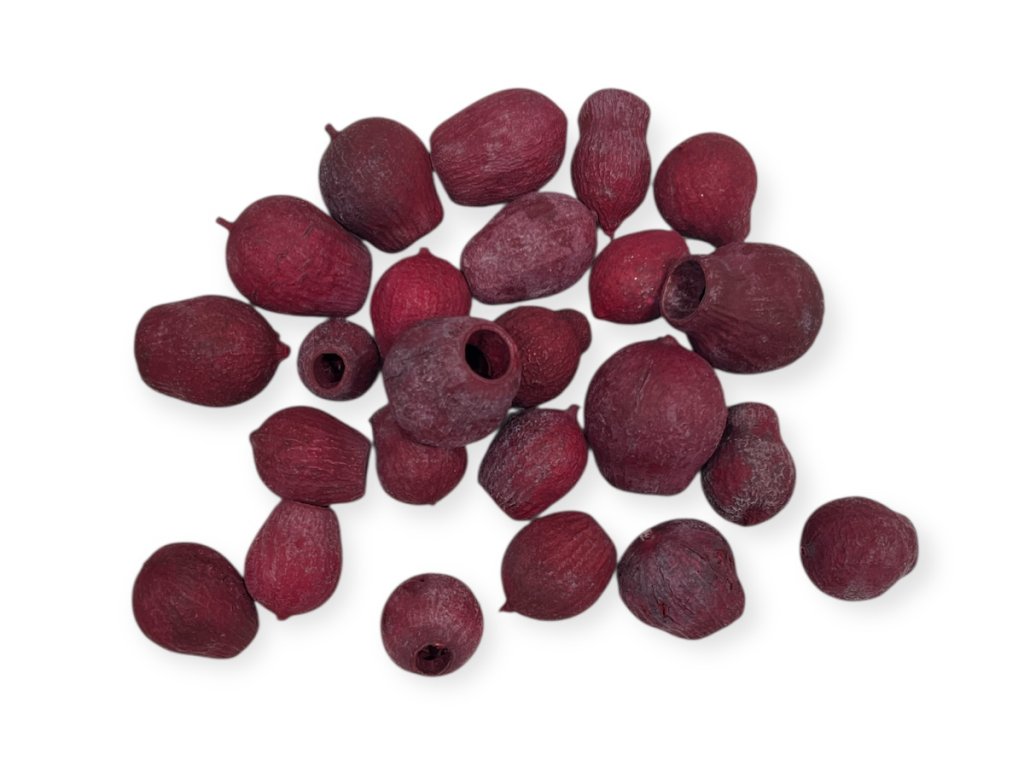 Dried Bell Gum eucalyptus fruits are among the universal decorative natural materials used in floristry, arrangements, and creative DIY projects. In burgundy, they look elegant, striking, and complement any arrangement in a modern way. Thanks to their firm, woody surface, they are suitable for gluing, arranging into wreaths, placing in decorative bowls, or combining with other dried materials.