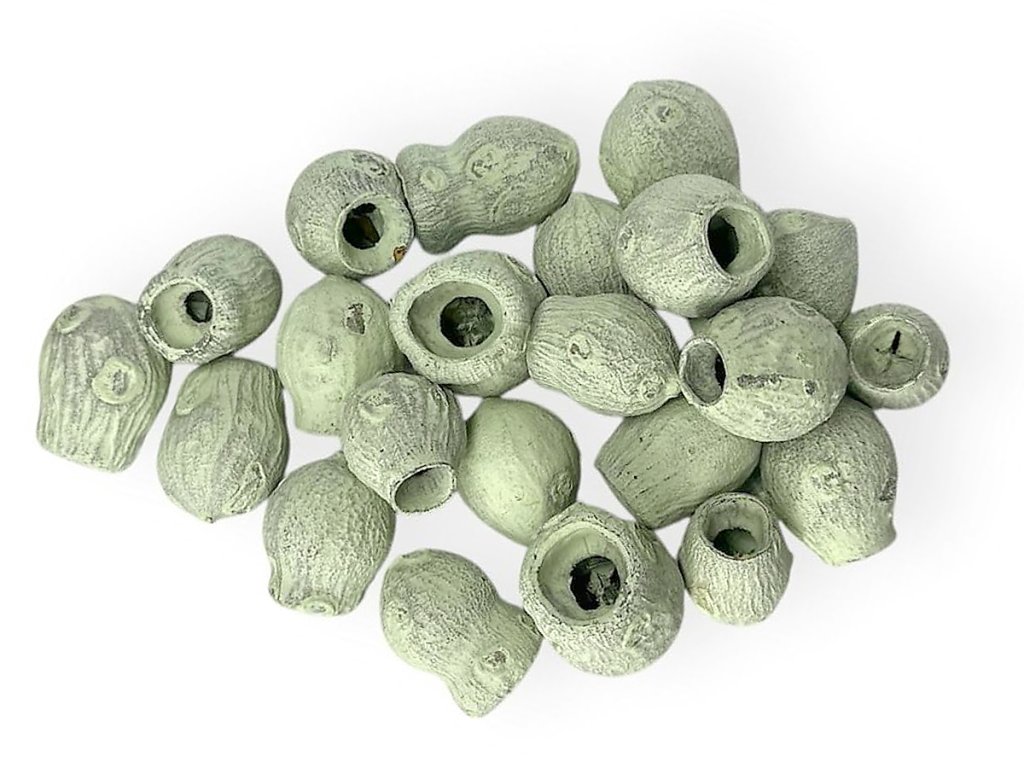 The fruits originate from the eucalyptus Eucalyptus leucoxylon, known as Bell Gum. After harvesting, they are dried and then surface-treated by immersion in an aqueous base with pigments. This coloring method is similar to water-based paint (e.g., interior wall paints) – it creates a matte, delicate surface that preserves the natural structure of the fruits. Each piece is unique and may vary slightly in shape and shade.