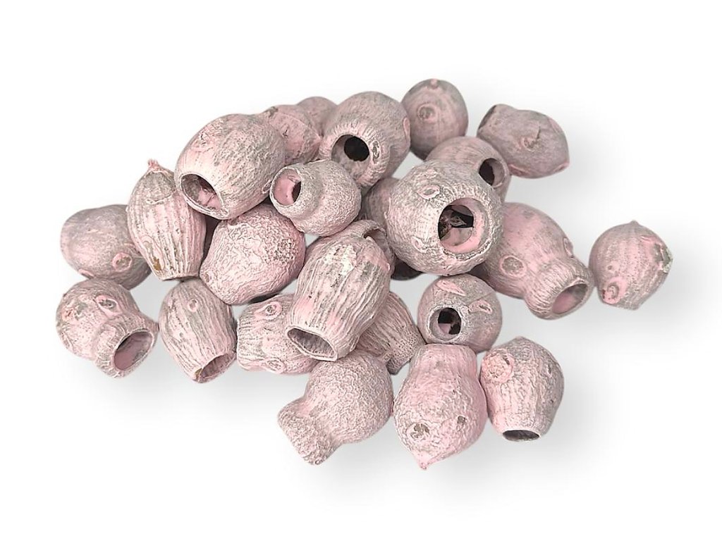 The fruits originate from the eucalyptus Eucalyptus leucoxylon, known as Bell Gum. After harvesting, they are dried and then surface-treated by immersion in an aqueous base with pigments. This coloring method is similar to water-based paint (e.g., interior wall paints) – it creates a matte, delicate surface that preserves the natural structure of the fruits. Each piece is unique and may vary slightly in shape and shade.