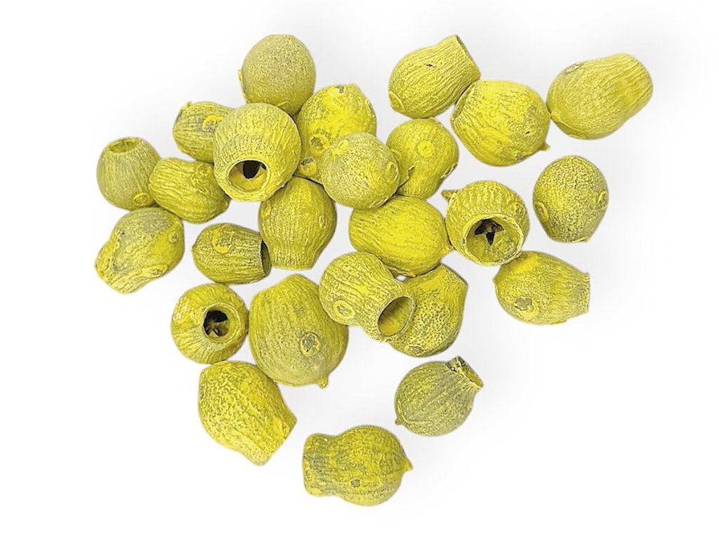 The fruits originate from the eucalyptus Eucalyptus leucoxylon, known as Bell Gum. After harvesting, they are dried and then surface-treated by immersion in an aqueous base with pigments. This coloring method is similar to water-based paint (e.g., interior wall paints) – it creates a matte, delicate surface that preserves the natural structure of the fruits. Each piece is unique and may vary slightly in shape and shade.