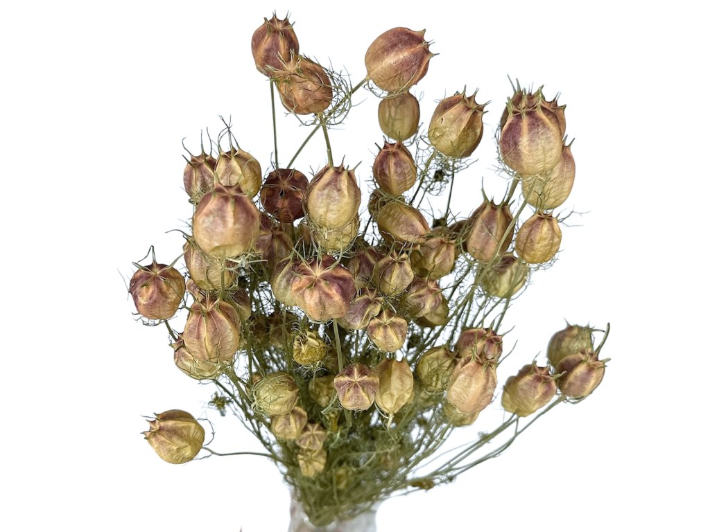 Love-in-a-mist has long been cultivated not only for decorative purposes but also as a medicinal plant. Its seeds were used in folk medicine. Dried seed pods symbolize simplicity, mystery, and purity. Natural color emphasizes its timeless character and fits into natural, boho, and vintage arrangements.