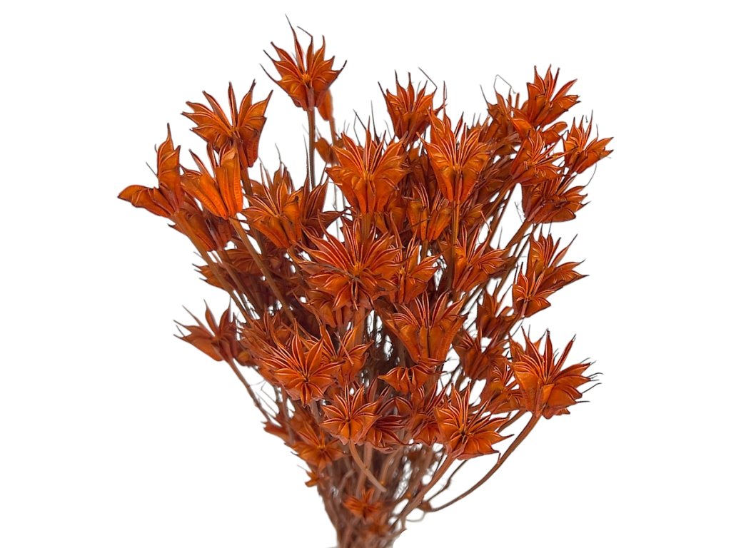 Nigella orientalis originates from the Mediterranean region, where it grows as a wild herb. After flowering, its decorative seed pods are harvested and then gently dried at a low temperature to preserve their shape and natural luster. The orange coloring is achieved by gentle toning with ecological dyes, which increase the durability and resistance of the plant. Each bundle is hand-sorted to contain a balanced combination of full and smaller seed heads.