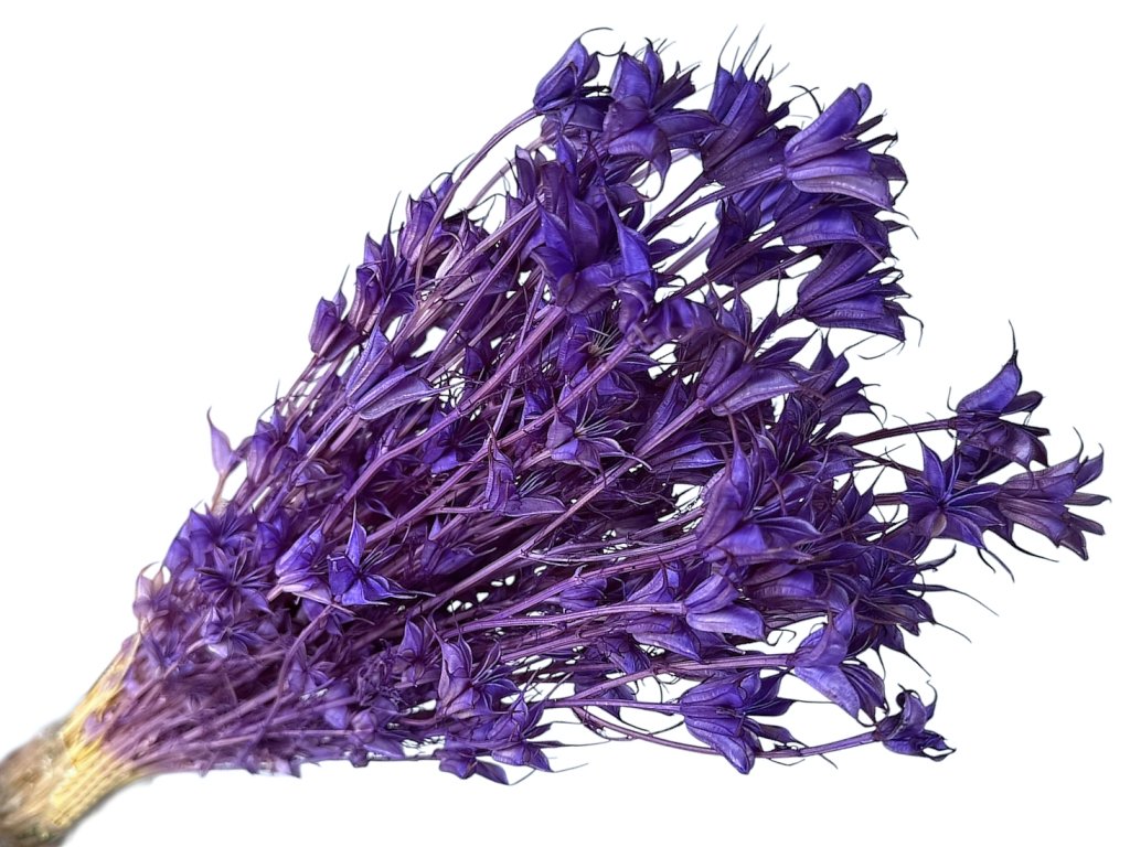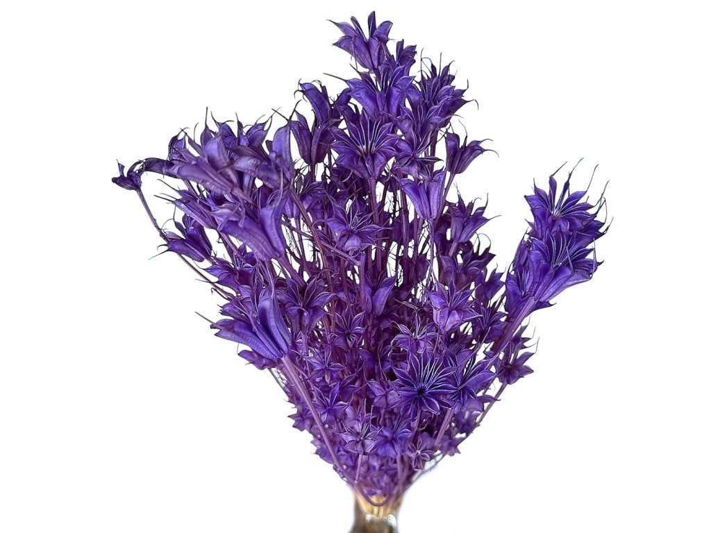 Eastern Black Cumin (Nigella orientalis) is among the traditionally popular dried flowers in decorative arranging. These flowers were grown in Europe and after harvesting, carefully dried, bleached, and subsequently hand-dyed to a deep purple (ultraviolet) shade. This processing method preserves the natural shape and delicate texture of the flowers.
