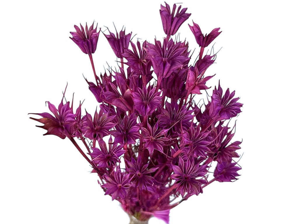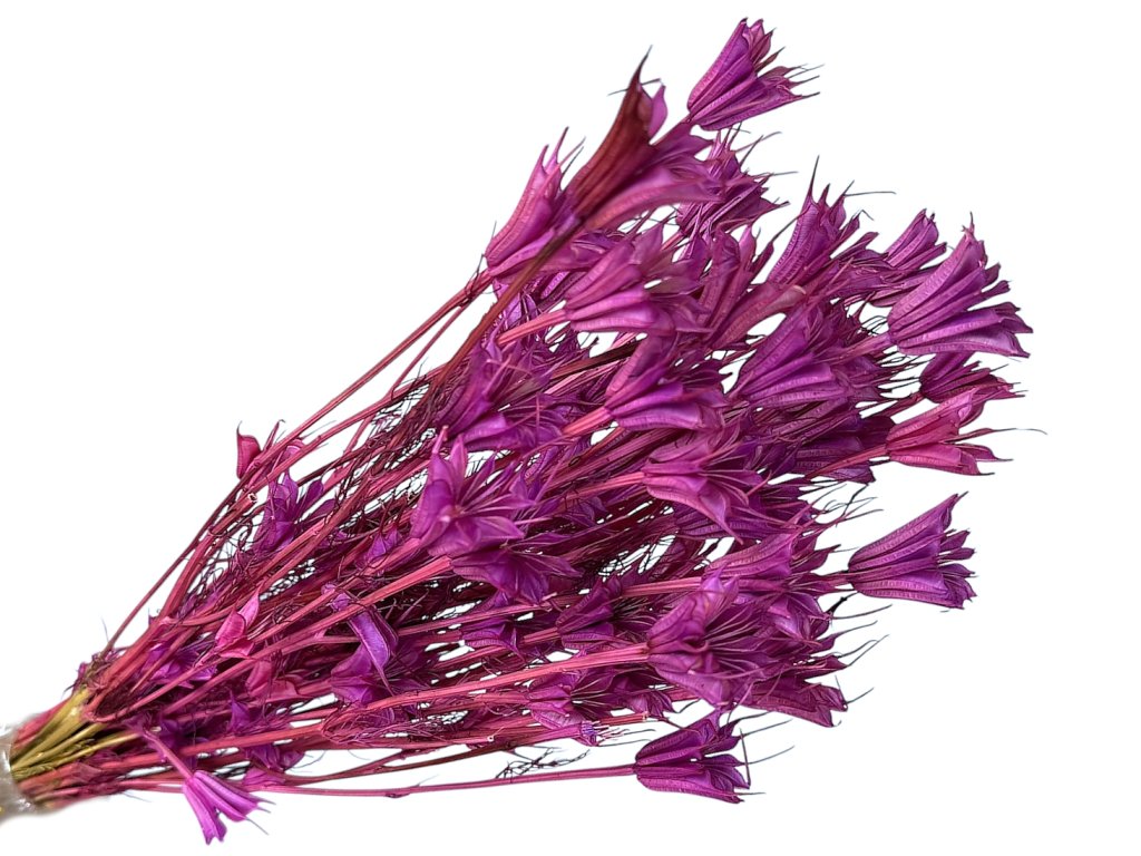 Nigella orientalis, also known as Love-in-a-mist, is a traditional floristry flower popular for its shape and structure. Grown in Europe, then dried and dyed a rich fuchsia color that combines purple and pink tones. In each bundle, you will find pods of various sizes with lightly colored stems.