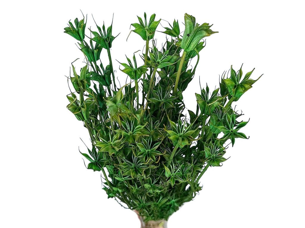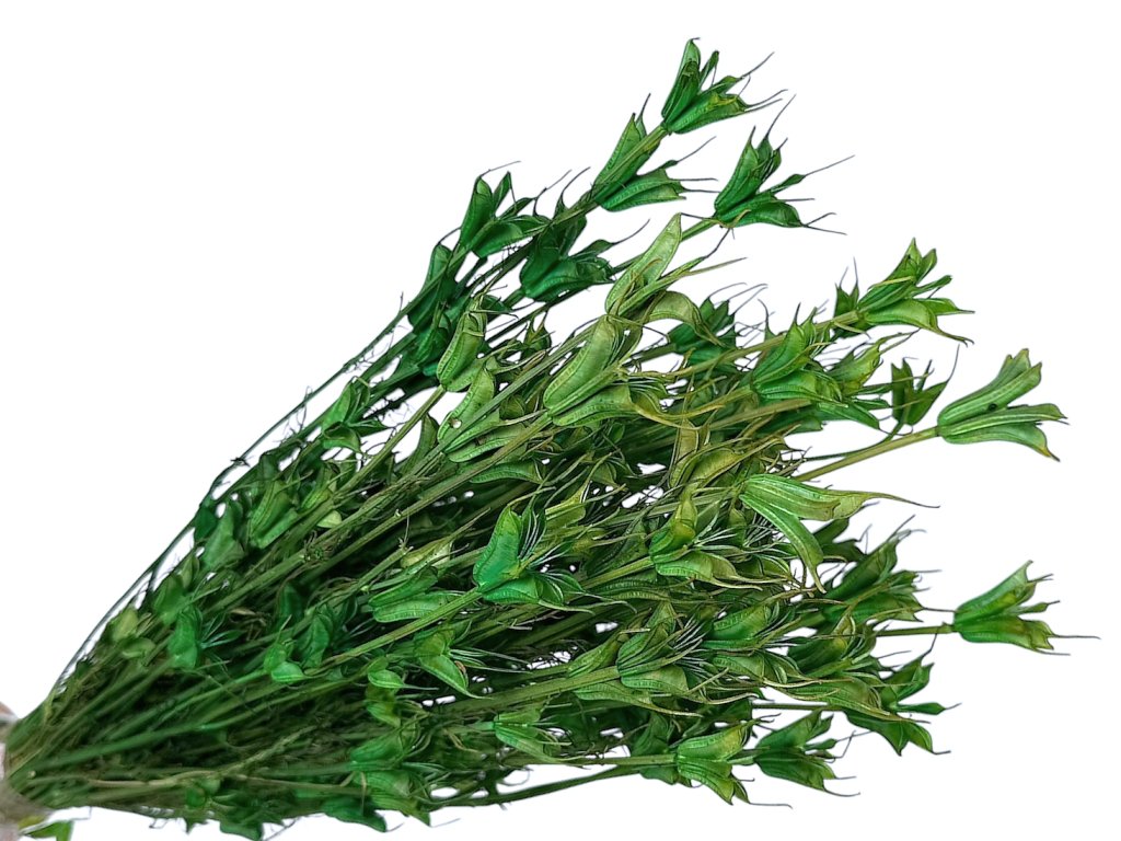 Nigella orientalis was grown in Europe and after careful harvesting it was dried and then dyed a deep green – a tone that resembles fresh spring grass. The characteristic seed pods retain their structure even after dyeing and are very popular among florists for their exceptional shape.
