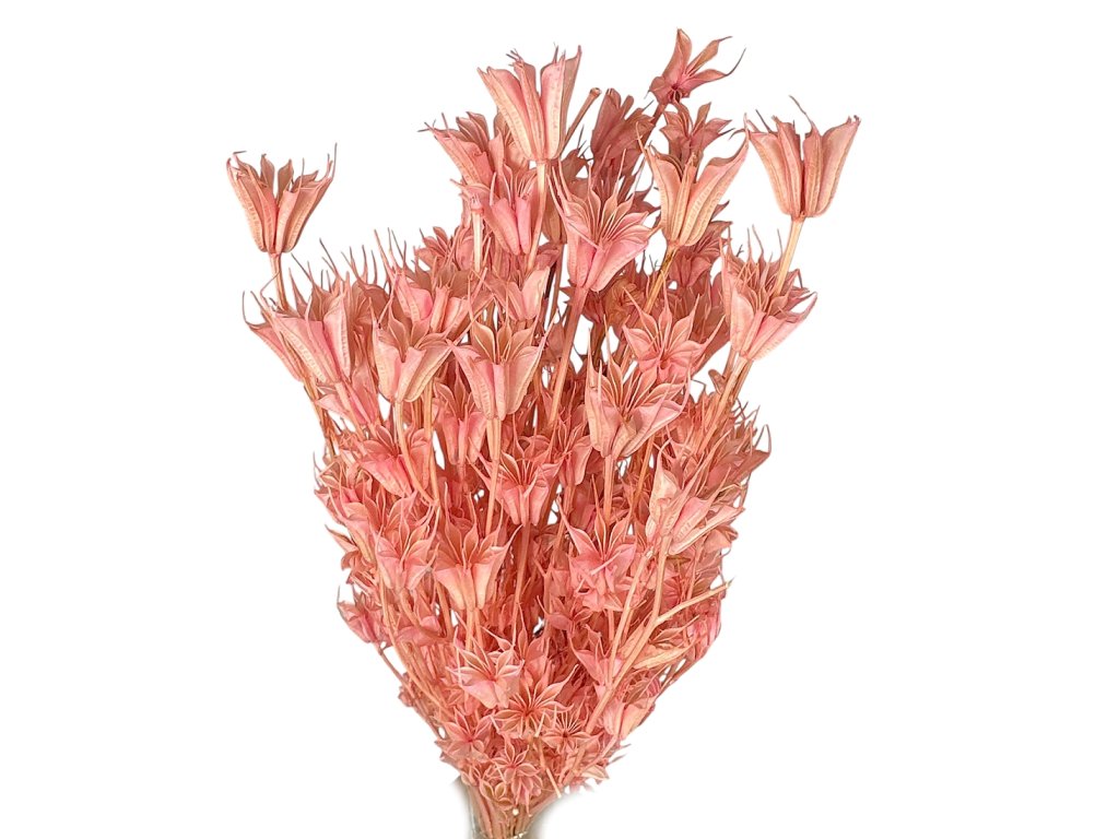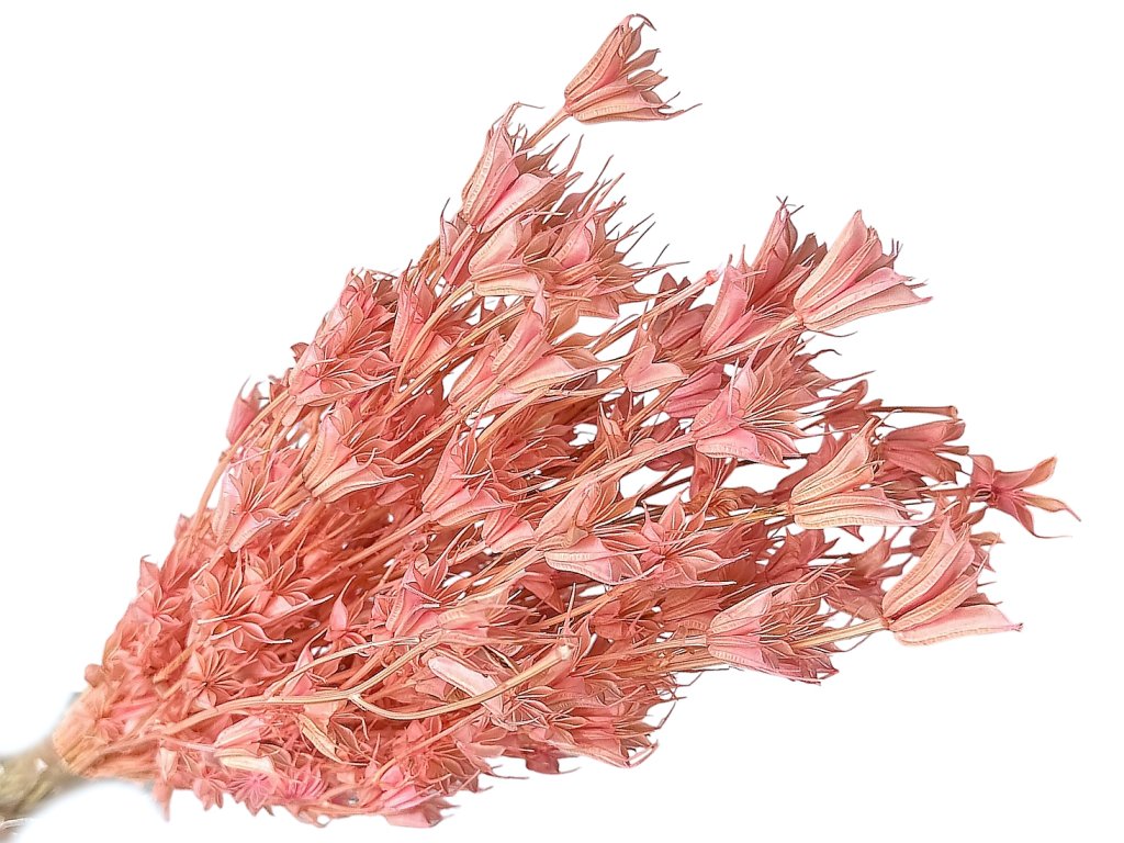 Nigella orientalis belongs to traditional decorative plants. It was grown in Europe, hand-picked, gently dried, and then dyed a delicate light pink tone. The characteristic seed pods are light yet stable, and have excellent durability in dried decorations.