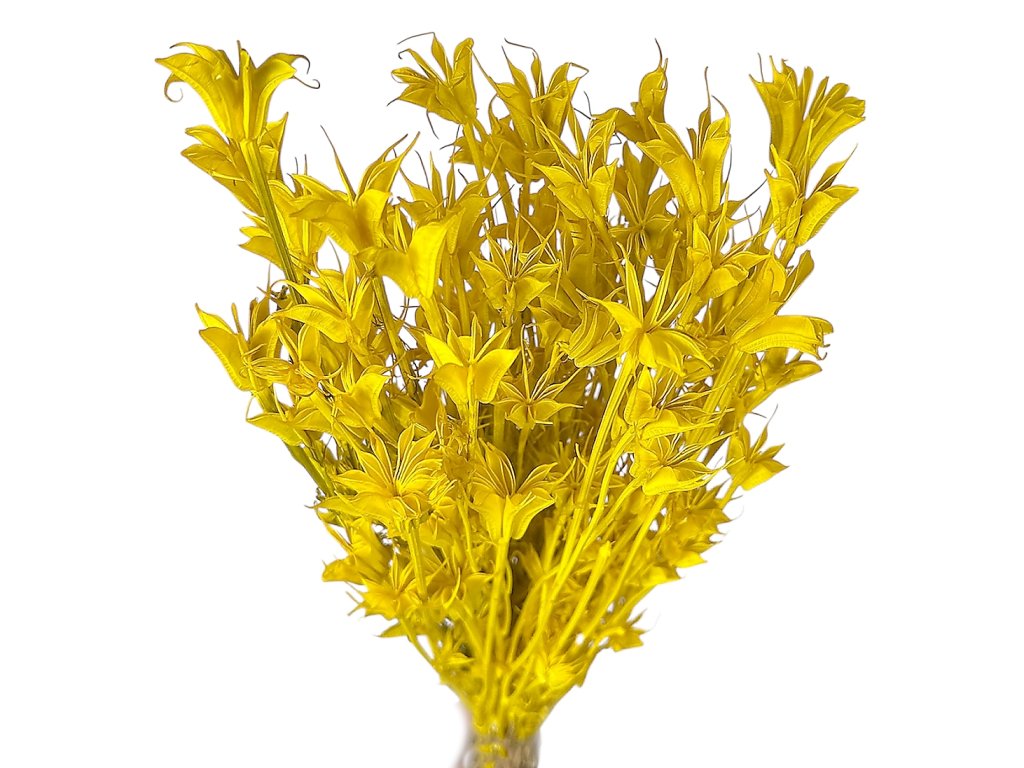 Nigella orientalis – also known as black cumin, nigella, or eastern nigella – is grown for its decorative seed pods. After harvesting, it is carefully dried and hand-dyed a vibrant yellow, while retaining its typical structure and fragility. The dried stems are slightly flexible, also suitable for tying.