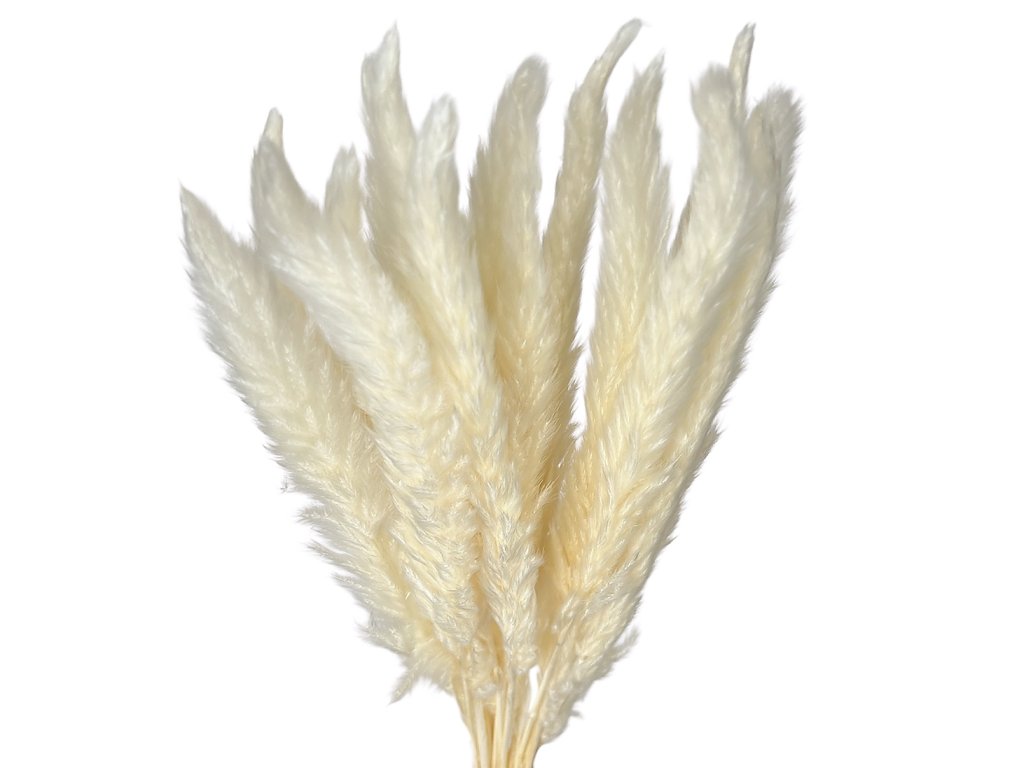 This pampas grass is carefully harvested and dried with an emphasis on preserving its delicate structure. The plumes are narrow, compact, and their vibrant white color is achieved through bleaching and gentle toning of the naturally occurring plant.
