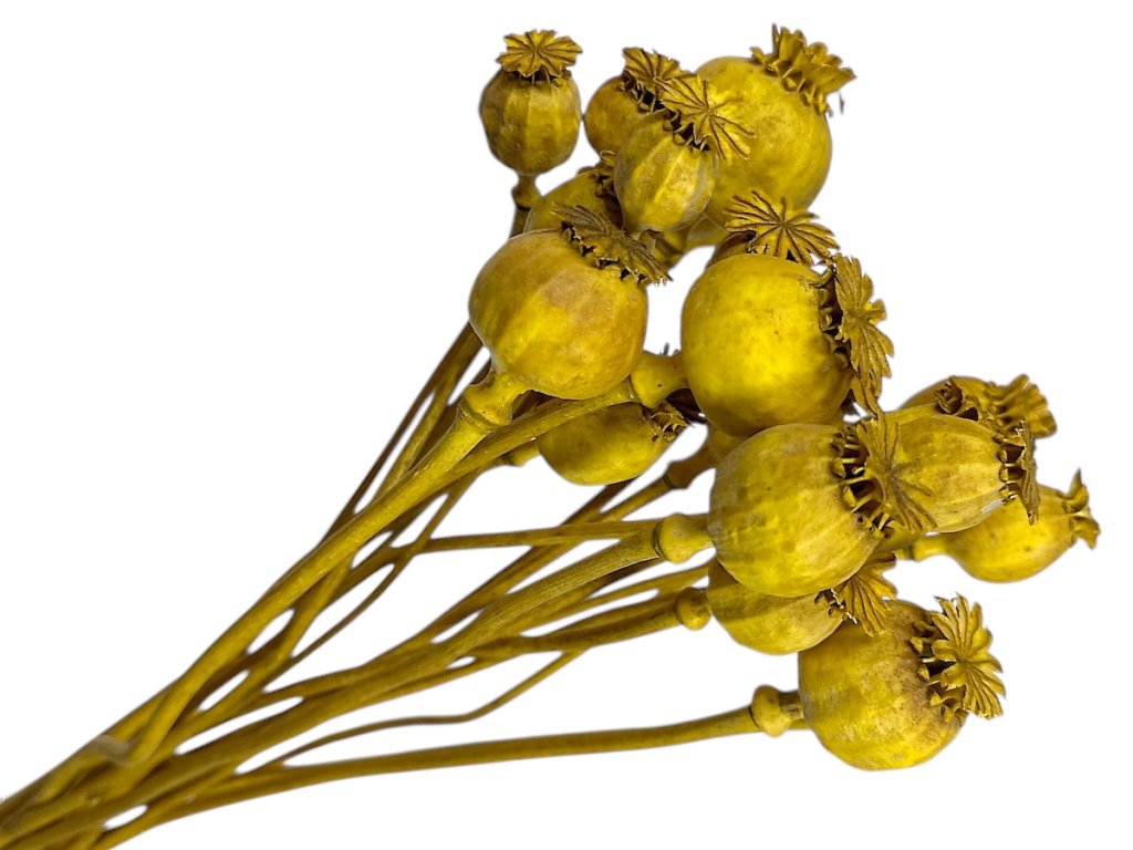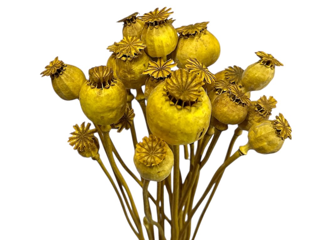 Poppy heads come from the opium poppy, which is cultivated using traditional methods on controlled Central European fields. After harvesting, they are naturally dried and coloured, preserving their shape. Dried poppy heads are then sorted and packaged with the stem attached for easy handling during arrangement.