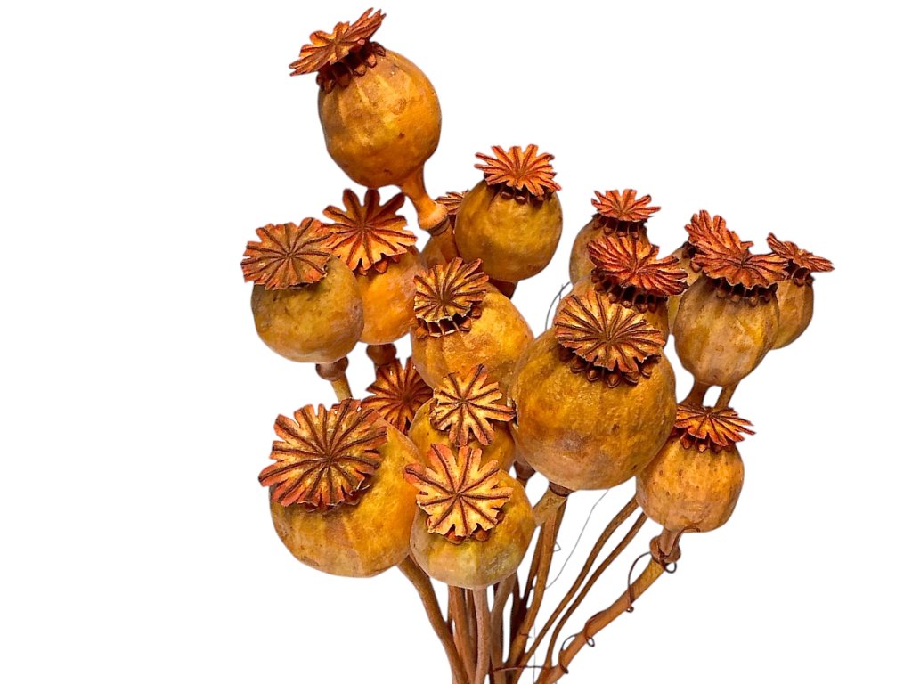 Poppy heads come from the opium poppy, which is cultivated using traditional methods on controlled Central European fields. After harvesting, they are naturally dried and coloured, preserving their shape. Dried poppy heads are then sorted and packaged with the stem attached for easy handling during arrangement.