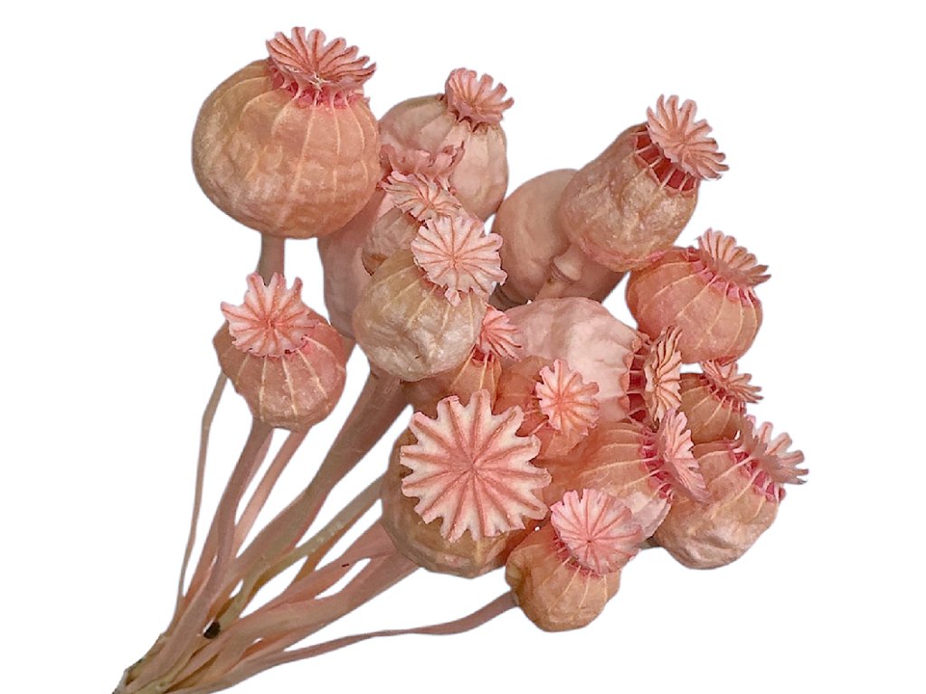 The poppy heads originate from European cultivation. They have undergone a stabilization and bleaching process, which has preserved their strength and structure. Subsequently, they were hand-dyed to a delicate pastel pink shade that resembles a powder tone. Each bunch is hand-sorted, ensuring the final product is visually harmonious.