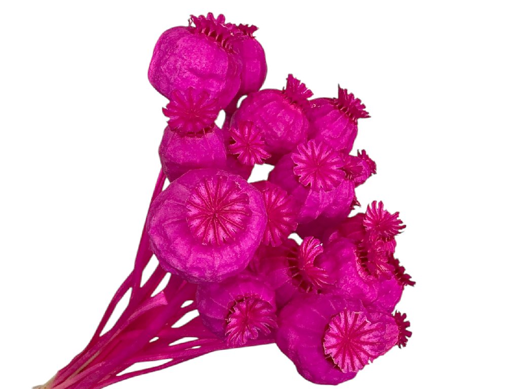The poppy heads come from European farms, where after harvesting they were stabilized, gently bleached and then hand-dyed to an intense cyclamen color. The bundles contain a mix of sizes – from medium-sized to miniature heads – which adds to their plasticity and structure.