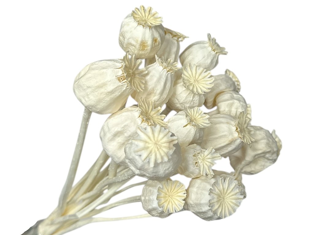 Bleached poppy heads are durable and maintenance-free. We recommend storing them in a dry place away from direct sunlight. If dusty, gently blow with cool air or carefully brush with a soft brush. To revive the color, you can use a professional spray for dried flowers (e.g. SPRING pro florist).