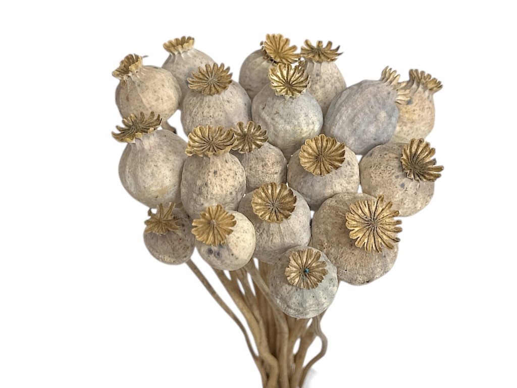 Poppy (Papaver somniferum), originally from Central European farms, is harvested after flowering and gently stabilized to retain its natural shape and shade. These poppy heads are not bleached or dyed – they stand out with an authentic grayish appearance that enhances their natural structure and delicate speckling.