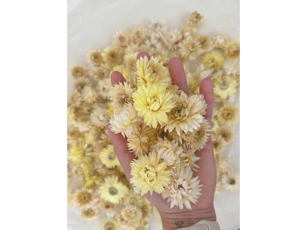 Helichrysum, also known as strawflower, originally comes from the Mediterranean and African regions. They are brought to the Slovak market from local farms where they are grown without chemical sprays. The heads are hand-picked and gently dried, preserving their intense color, delicate fragrance, and natural shape. The products are fully compostable and ecological, with a low carbon footprint.