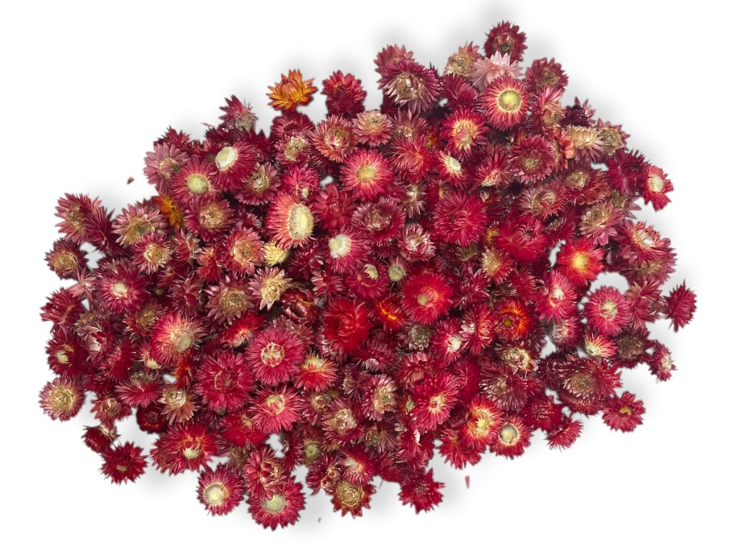 Dried Everlasting Flowers - Helichrysum - dark red Dried Helichrysum everlasting flowers in a rich red colour, in a 100g bunch, bring passion, energy, and a striking accent to...