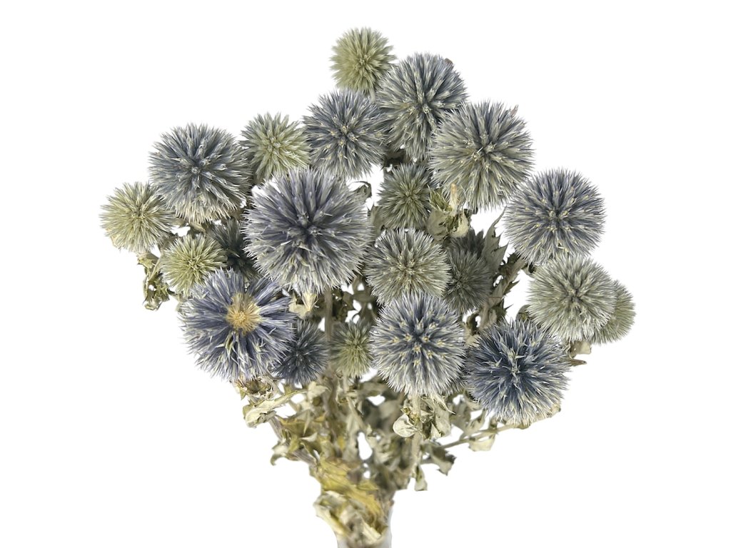 Echinops – Blue Globe Thistle, native to central and southern Europe – is a perennial herb known for its prickly spherical flowers. After harvesting in the summer season, it is dried in bunches naturally in the air. This version is purely natural, uncolored, and retains the natural grey-blue hue typical for this species.