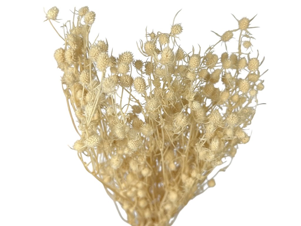 Eryngium originates from the Mediterranean region and Central Europe. Harvesting takes place during full bloom, when the plant has its most distinct shape. After careful drying, the thistles are gently bleached to preserve their structure and achieve an elegant shade suitable for neutral decorations.