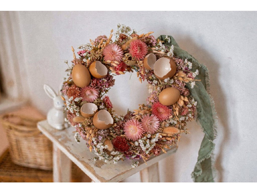 In combination with white or cream straw, dried achillea, moss, wheat ears and fine meadow grasses, you will create a harmonious Easter arrangement in a natural and country style.