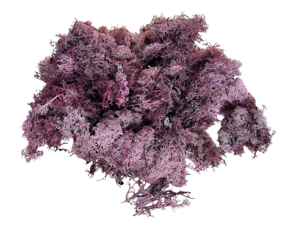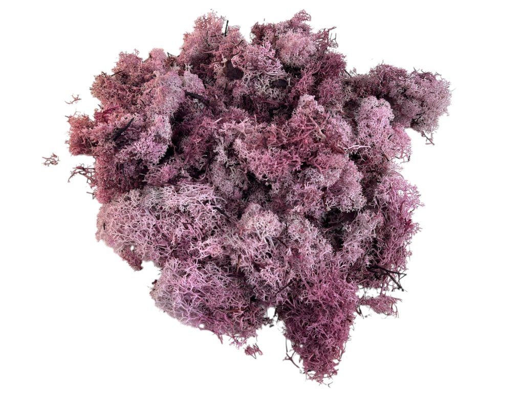 Stabilized pink-purple reindeer moss (Cladonia rangiferina) in a 250g package is the perfect material for smaller decorative projects – delicate additions to moss paintings, wreaths, logos, or dried flower arrangements. Thanks to its flexible and soft structure, it easily adheres to wood, MDF, or canvas and harmonizes beautifully with natural materials. The delicate pink-purple color brings harmony, romance, and a touch of elegance to the interior.
