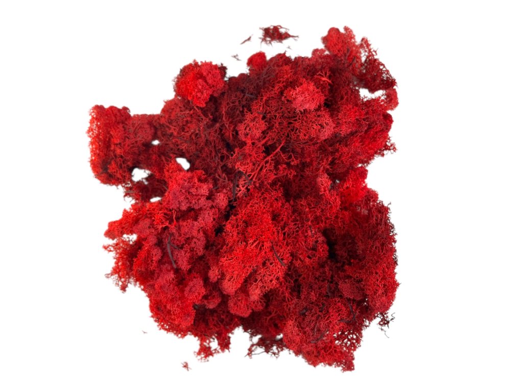 Icelandic moss is called reindeer moss because it was traditionally used for reindeer bedding in Nordic regions. This moss grows slowly and its harvesting is ecologically sustainable, as the underlying plant is not damaged with the correct technique. The red color adds energy and a striking visual element to arrangements, enhancing any floral or natural arrangement.