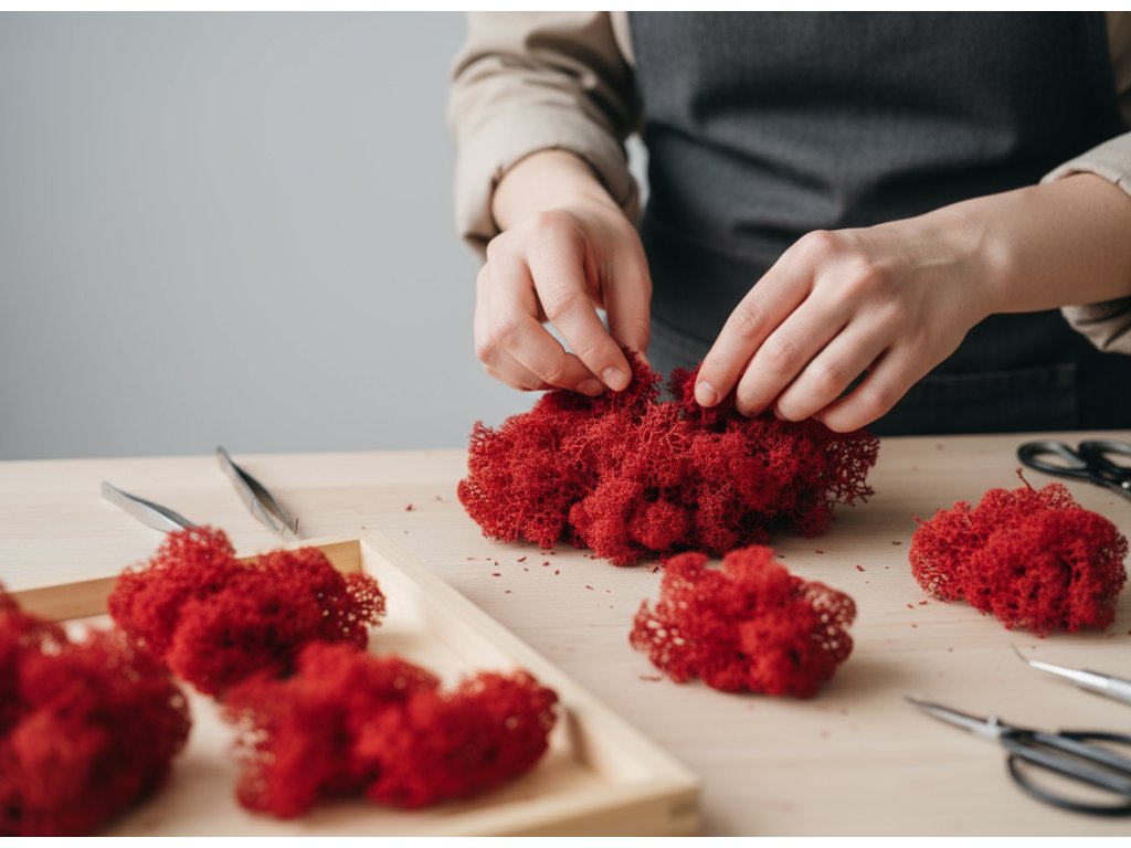 Red Icelandic moss, also known as reindeer moss, is ideal for creating original natural arrangements. It is suitable for vases, making wreaths, decorations, or creative projects. Thanks to its delicate structure and durability, it can liven up any interior without the need for regular care. It is suitable for minimalist, rustic, boho, and modern arrangements.