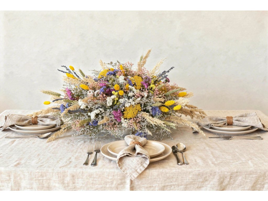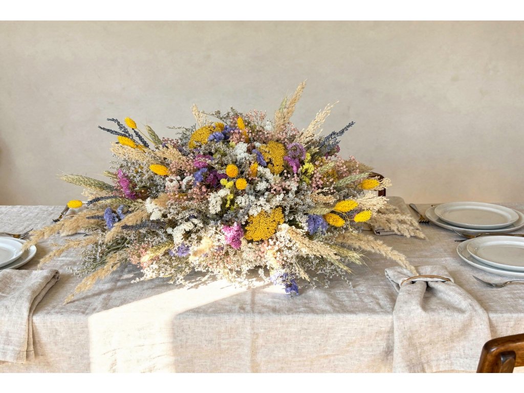 The MATILDA composition combines delicate meadow romance with earthy richness. Statice tatarica, yellow achillea and yellow craspedia dominate, adding light and energy to the arrangement. Purple and pink limonium brings color depth, while yellow phalaris, meadow grasses, and wheat ears create natural movement and lightness. Dried lavender adds a delicate Provençal touch, and pink gypsophila softens and harmonizes the entire arrangement.