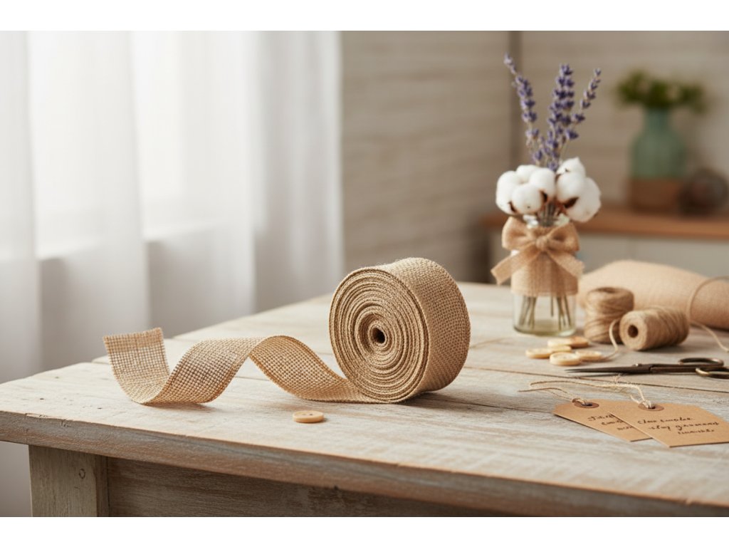 Jute ribbon 5 cm × 9 m – natural Natural jute ribbon 5 cm wide and 9 m long, ideal for tying flowers, decorations, gift wrapping, or creative DIY projects.
