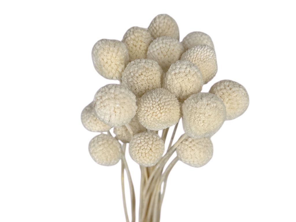 Craspedia Globosa, also known as “Billy Buttons” or “Drumstick Flower”, originates from Australia and New Zealand. The plant is stabilized using an ecological solution based on glycerin, which replaces the natural plant sap. Thanks to this, the flowers retain their flexibility, softness, and long-lasting durability. The stabilization process takes place without the use of synthetic dyes or preservatives – the result is beautiful white spheres with a delicate matte surface that appear both natural and luxurious.