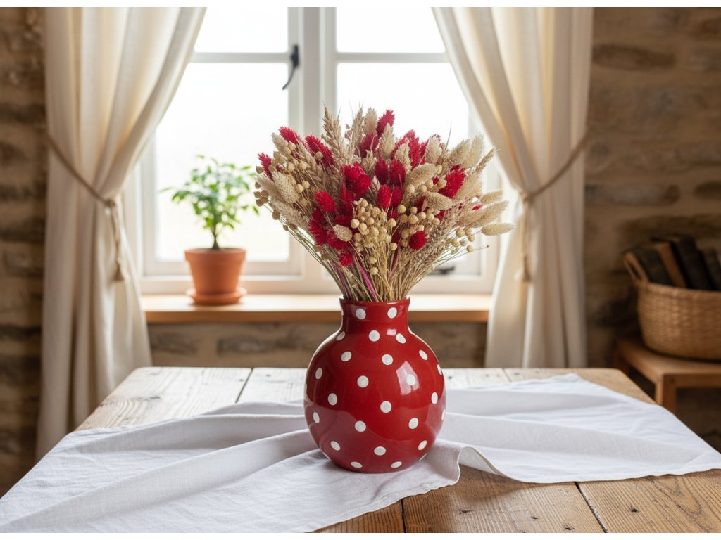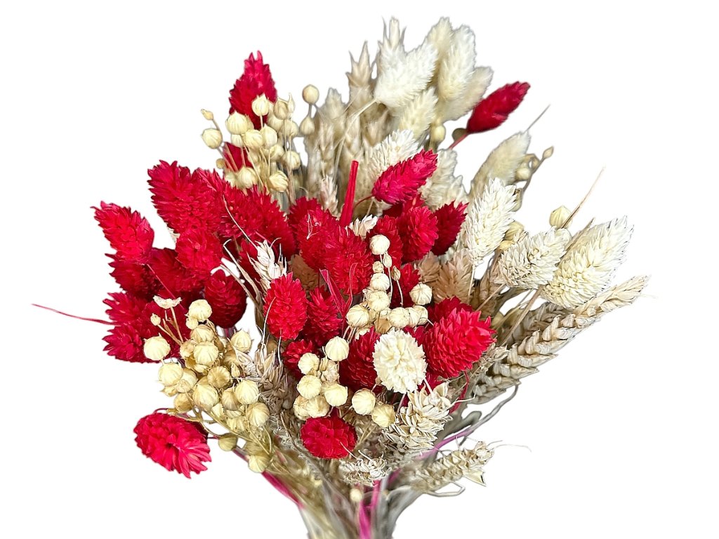 The bouquet is carefully mixed from naturally dried plants originating from small farms and local fields. Wheat, flax, and phalaris are hand-picked at their optimal stage, then dried, bleached, or dyed to achieve a balanced combination of natural and red hues. Each bouquet is unique — stem length and colour intensity may vary, adding authenticity and character.