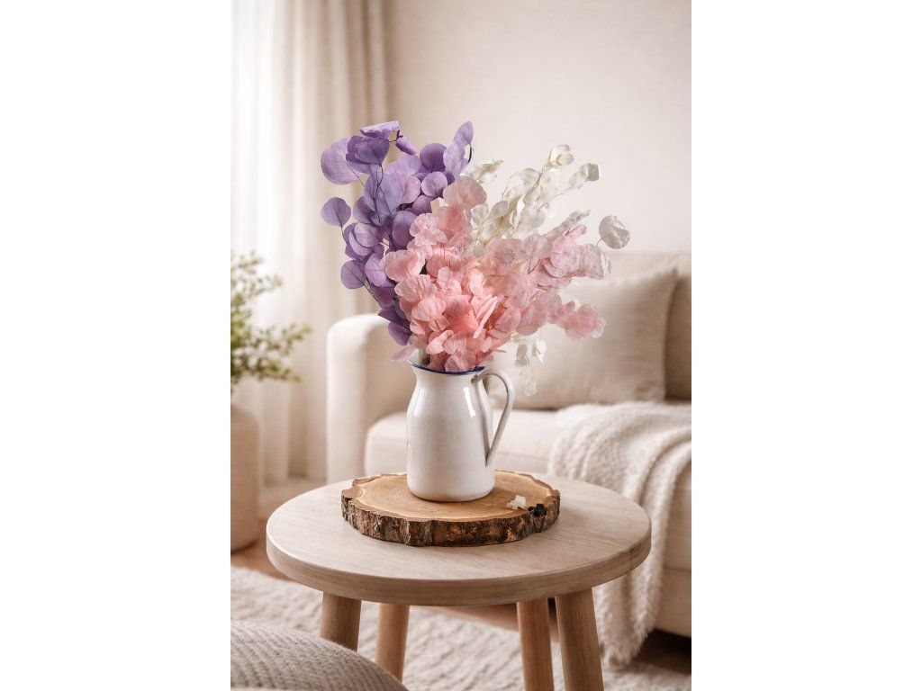Eucalyptus Populus (Eucalyptus populus) is a natural leafy material that undergoes a stabilization process – natural sap is replaced with a glycerin-based preservative solution. Thanks to this, the leaves retain their natural appearance, flexibility, and long lifespan. The color is gently tinted to a faded, rustic purple hue