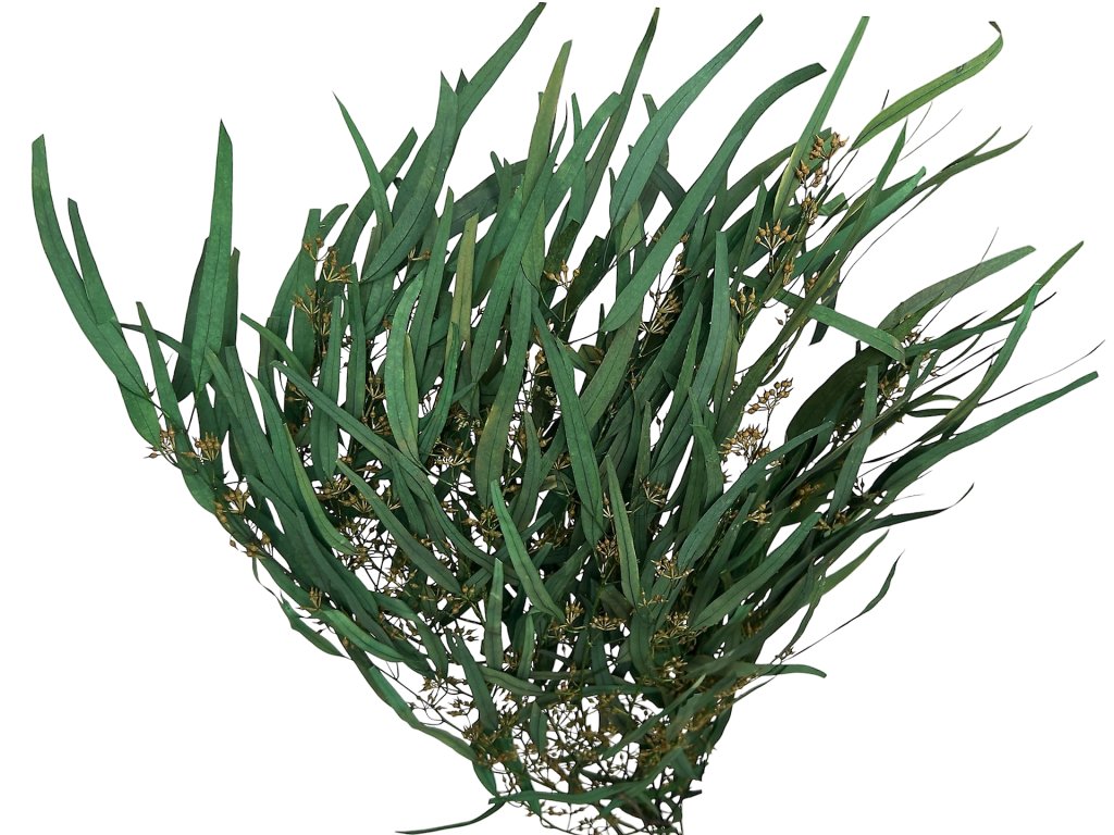 Eucalyptus Willow originates from Australia, where it grows in warmer regions. The leaves were carefully harvested, then stabilized and colored with natural dye to preserve their typical scent, color, and shape. The miniature fruits are left in their original state, thus completing the authentic look of the entire branch.