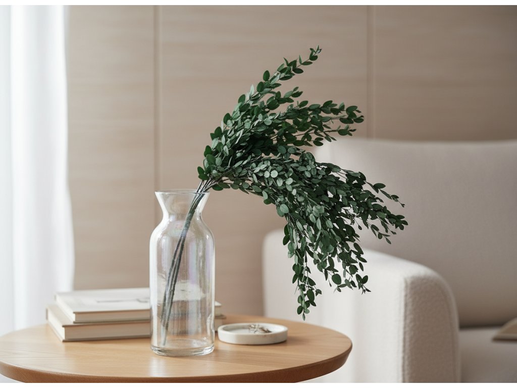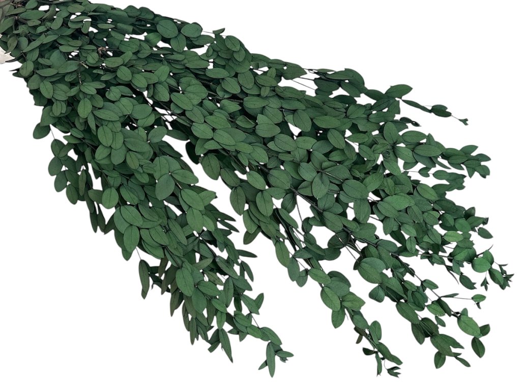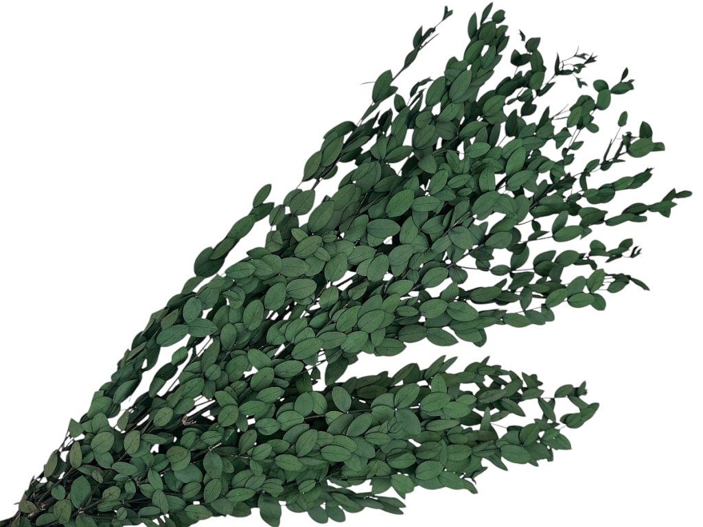 Eucalyptus parvifolia originates from Australia, where it grows as a small-leaved, decorative species often used in floristry. Harvesting takes place during the period when the leaves are flexible, firm, and of the highest quality. Stabilization is carried out by replacing the sap with a gentle stabilizing solution that preserves the natural appearance and flexibility. Thanks to this, eucalyptus remains without water, without maintenance, without shedding, while retaining its dark green shade and typical leaf structure. Plants processed in this way are valuable for professional florists and designers, as they provide a durable and always fresh-looking material.