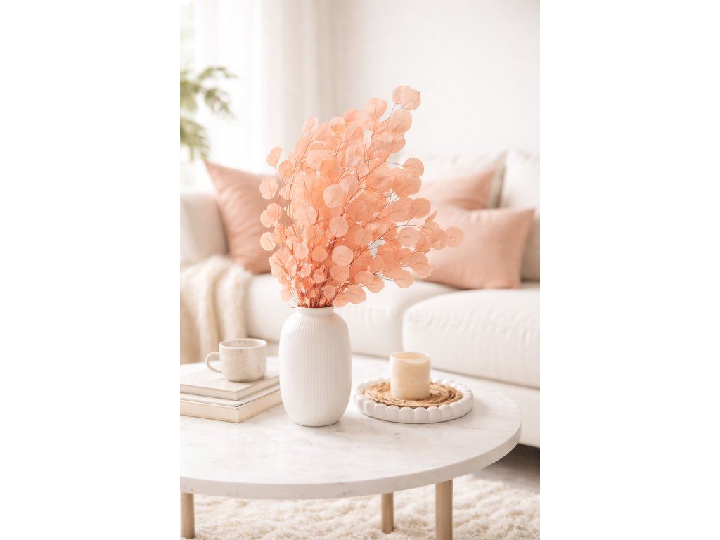 Eucalyptus Populus (Eucalyptus populus) is a natural leafy material that undergoes a stabilization process – natural sap is replaced with a glycerin-based preservative solution. Thanks to this, the leaves retain their natural appearance, flexibility, and long lifespan. The color is gently tinted to a pastel apricot shade.