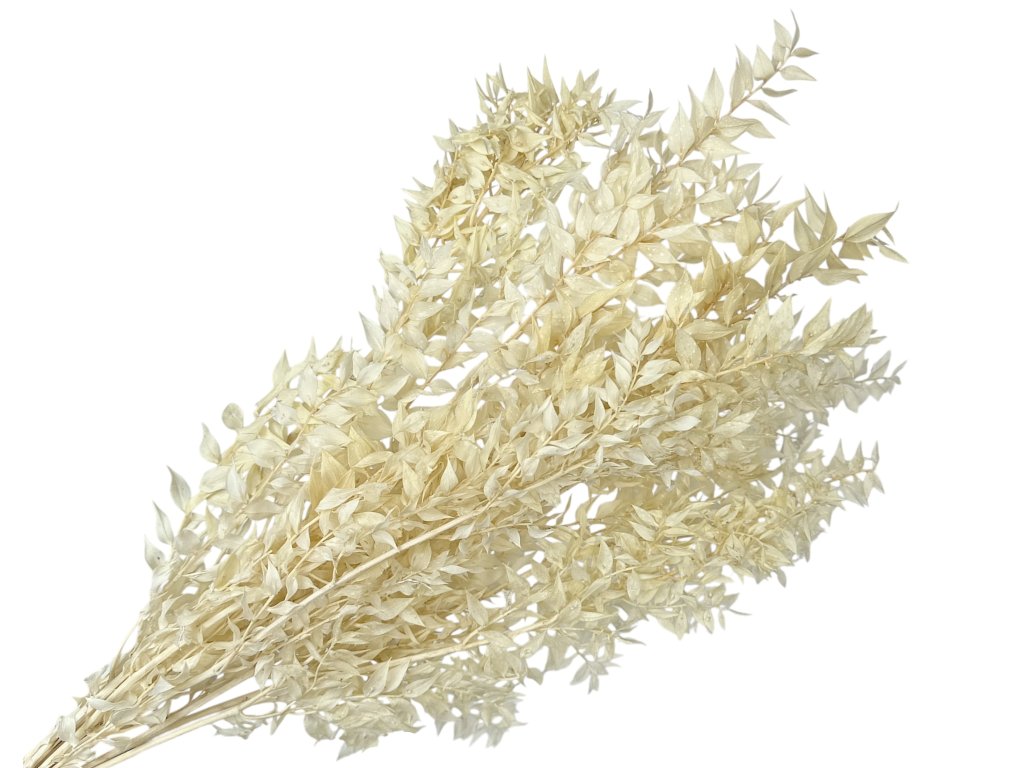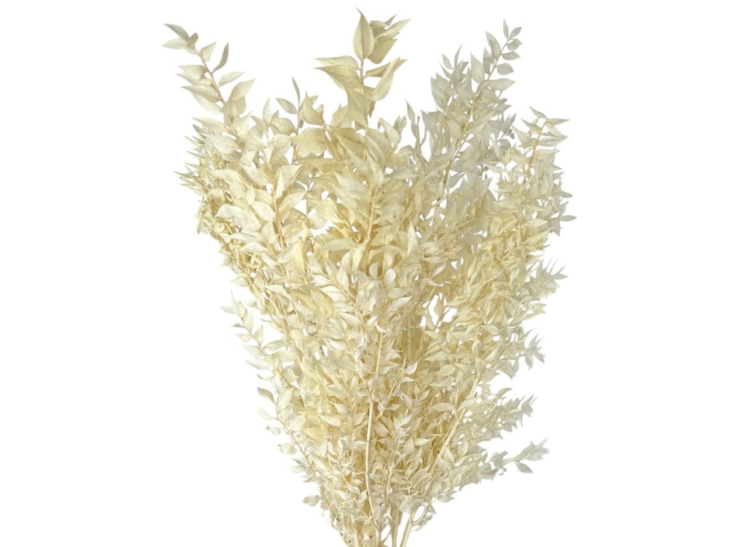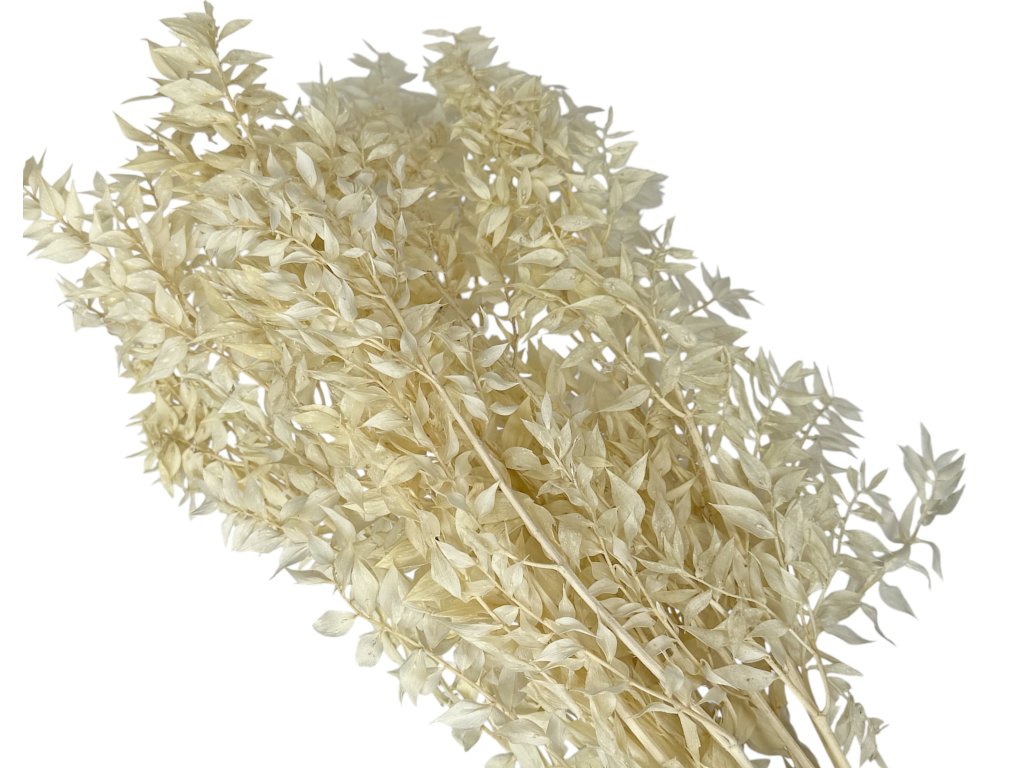 Ruscus (Ruscus aculeatus) originates from Europe and the Mediterranean. The leaves are gently stabilized after harvesting with a glycerin solution with dye, which replaces the natural sap. Thanks to this, they retain their flexibility, rich color, and natural appearance. Through subsequent bleaching, they acquire a delicate, creamy-white shade that looks modern and decorative.