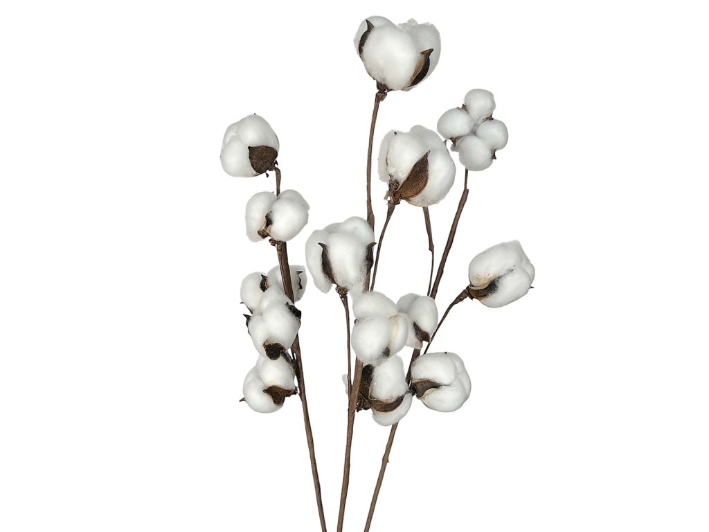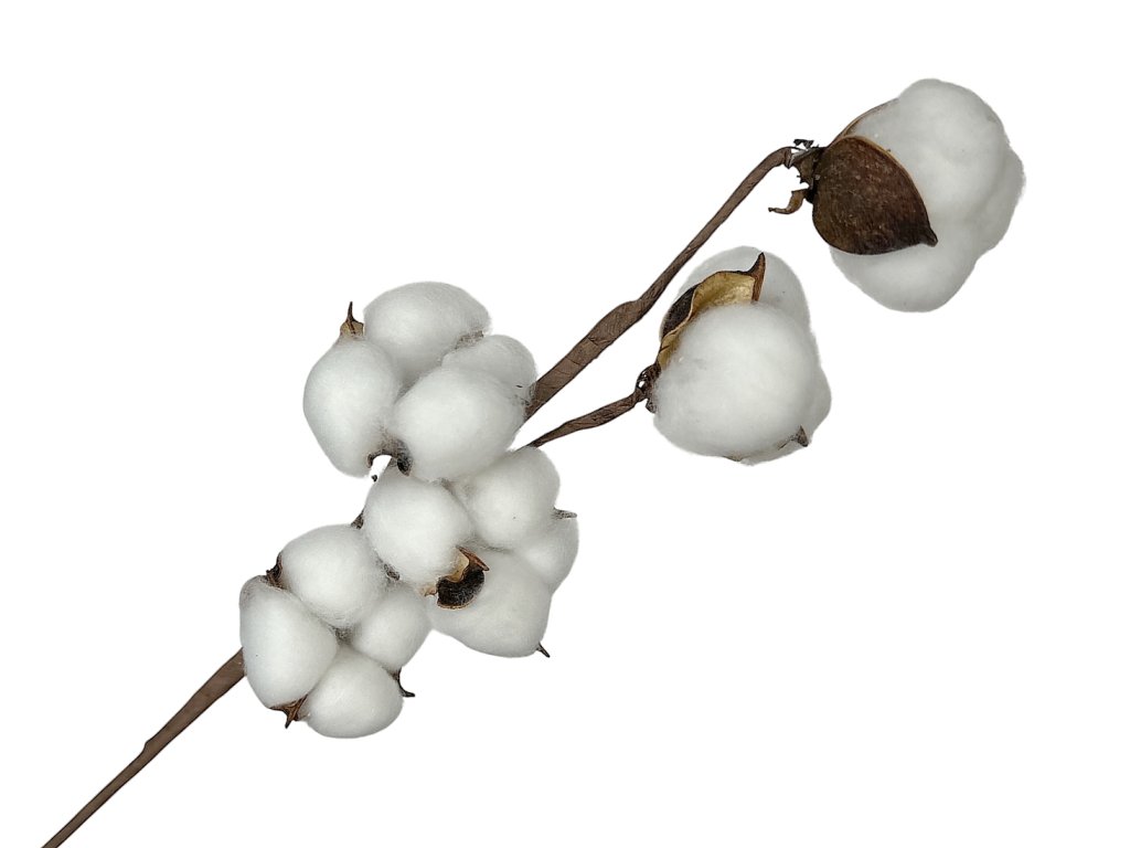 Cotton (Gossypium) originates from tropical and subtropical regions. After ripening, the seed pods naturally open, revealing delicate white fibers. For decorative purposes, the flowers are collected and then arranged by hand – in this case, they are attached with floral tape to a wire base, making the stem sturdy, easy to shape, and suitable for further creative processing.